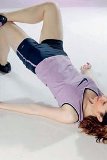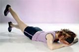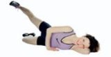 Ľahneme si na ľavý bok, hlavu oprieme o ľavú ruku, pravú položíme voľne pred trup. Pokrčenú pravú nohu položíme za vystretú ľavú, ktorou pomaly kmitáme zhora nadol. Opakujeme 15-krát a cvičíme druhou nohou.